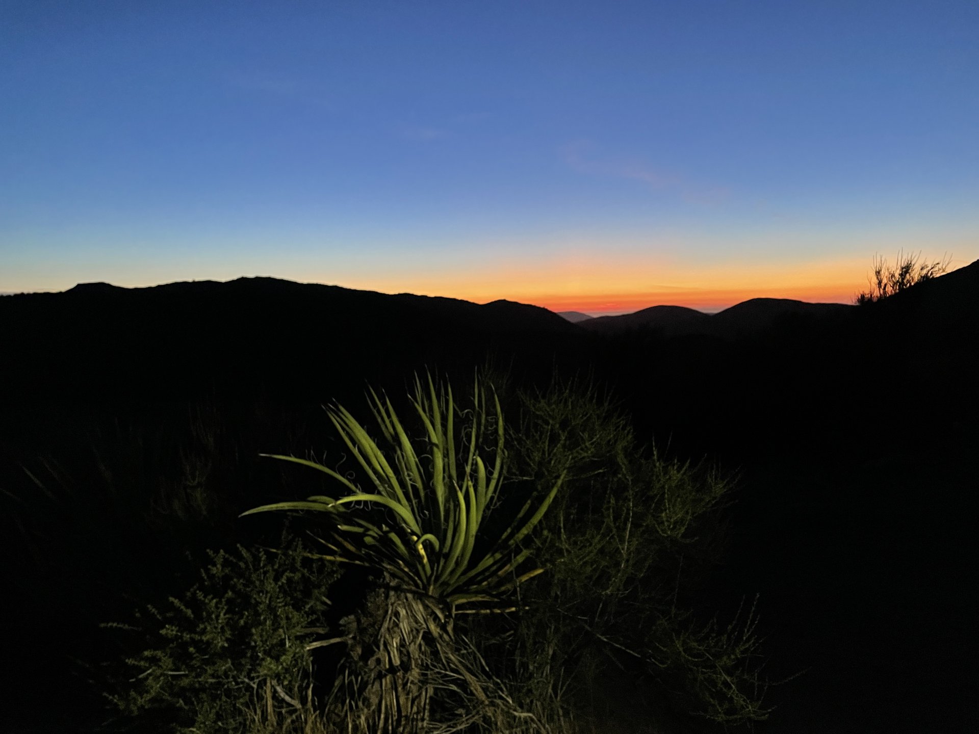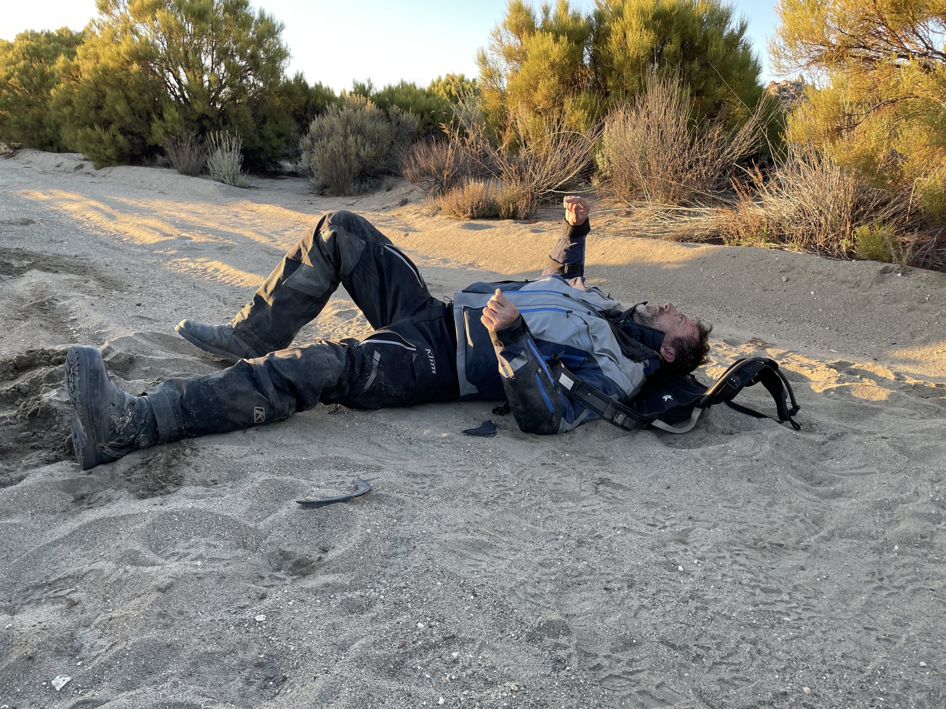 At the lunch stop, we took over the little cafe. I think they appreciated the large crowd, but they got worked! Our friendly wait staff. After the meal, the normal tab gyrations started happening - who had what, etc, etc. We finally told them to just add everything together and we would divide by the number of people. After 15 mins of adding, etc, the total came to 600 pesos. Before the high level math started (each person owes xx pesos), i figured that i would just cover the $30 (US) tab and let the poor help recover. I mean, really, $2 (US) per person for some excellent tacos, burritos, cokes, etc! Back on pavement, we continued SE'ly along Hwy 3, to Lazaro Cardenas, where we stocked up on Tequila, some snacks, and water before heading off into the hills in search of Mike's Sky Ranch. Mike's is at altitude, in one of Baja's park areas. It is famous as being a stop on the Baja 1000, either during the race, or for the crews pre-running the course before the race. There is electricity (which they shut off around 9), food and rooms. Meals are served family style and included in the room price. But, you have to get there. With a setting sun and the silt and sand, it was hard riding out of Cardenas. We really didnt have any incidents until we were about 6 miles from Mike's, when Allen dumped his bike in the sand. Given how well he had done all day, i figured he must have been getting tired and in a little pain from the mud puddle drop. I was following behind him, sweeping, when i saw him lose his front wheel in the sand. (Allen waiting for the stars to rise, or leave his eyesight) He must have landed hard on an arm, or something as the pain kept him from getting up from about 15 minutes or so. Adam really wasnt waiting impatiently ? We got him up and moving again, but he must of run out of confidence, as he kept losing it in the sand (speed is your friend). Some others came back and we worked at making progress towards Mike's but eventually the pain and sand became too much. We hid his bike and Allen hopped on the back of Matt's bike and rode the 6 miles into Mike's. One good thing about arriving late, is the sunset....