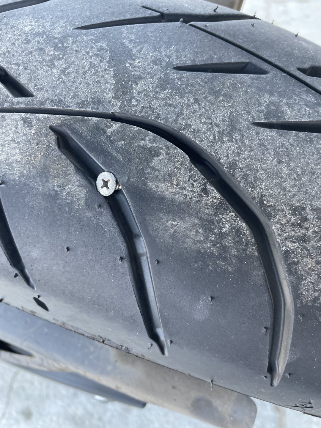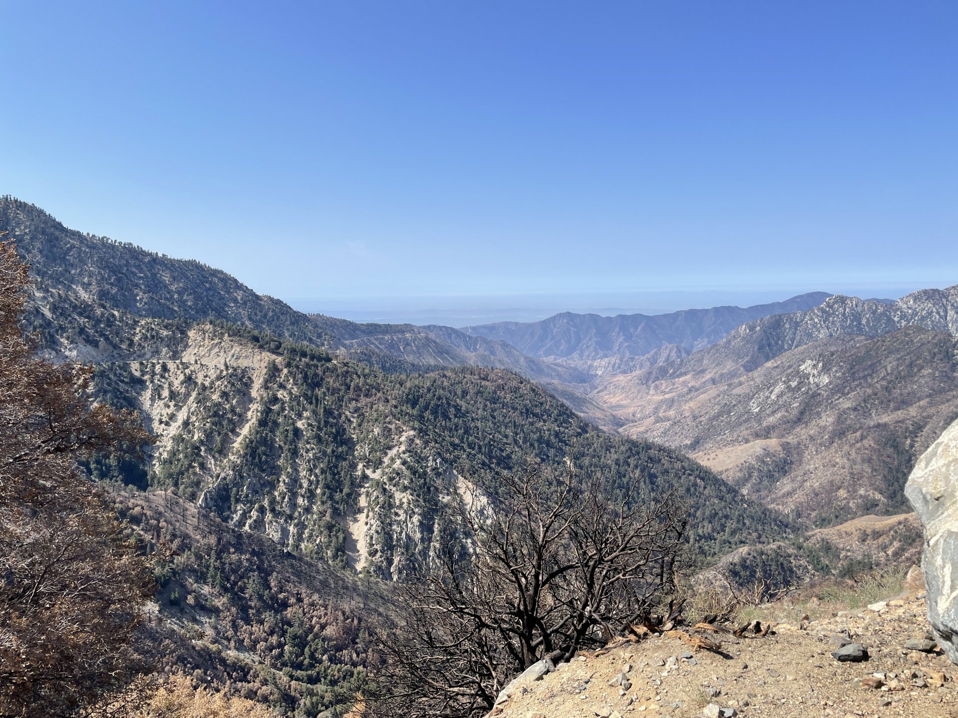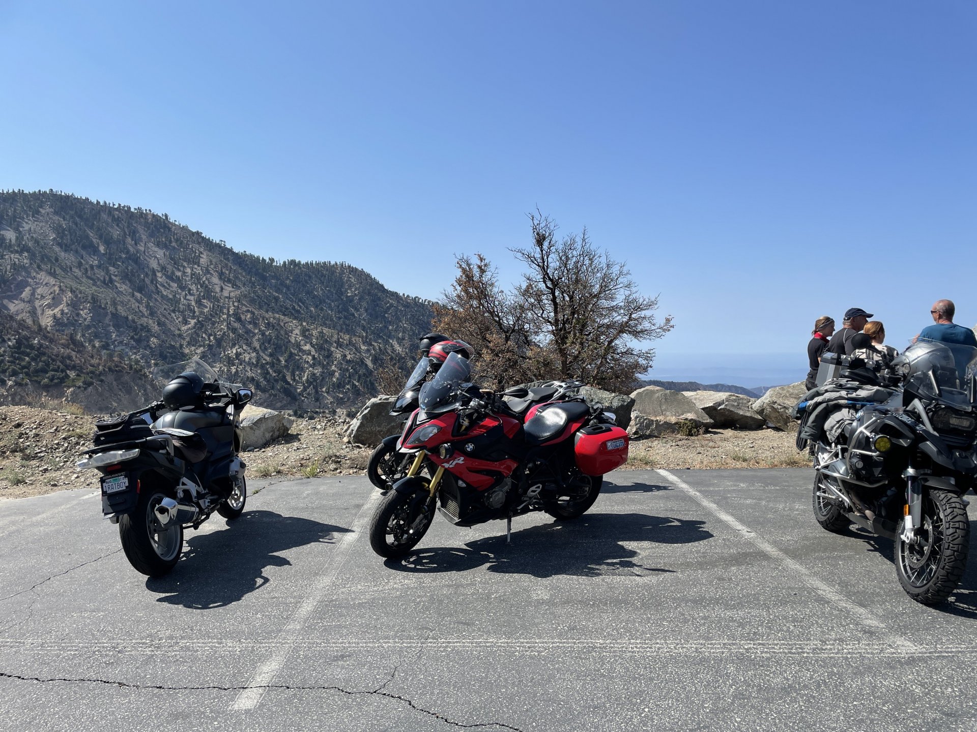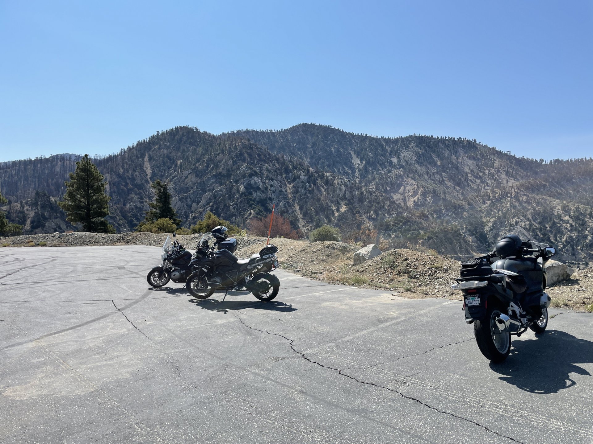 Saturday, club run up Angeles Crest Highway (look it up - local squid run for Los Angeles) to Lake Arrowhead for lunch. First thing we saw was a body on the highway, covered and surrounded by Highway Patrol. Found out later a bicyclist climbing up the mountain must have expired. Makes for a sober ride. some fine classics at the meetup spot. After lunch, a spirited ride back over the Crest, and down Upper Big Tjunga (one of my favorites in that area) and out and down to civilization. Trying to find the most curves we could. Then, Sunday, another friend was leading a group ride for Aether Apparel and back up the Crest we went: Newcomb's Ranch was busy. Still trying to figure out why it closed and the land is up for sale. Trying to get the club to chip in $6k each to buy it! Would make for a great clubhouse, BNB, restaurant, shop, etc! Sunday's ride included some offroading along the myriad of forest service roads in the area. Kind of hard to grasp that we are about 15 miles from around 12 million people! It was a long, hot day on the trails. But lots of fun riding new roads and finding new camping options. Woke up this a.m. to proof its Monday: Couldnt run over that with the old tire. had to pick it up with the one that has just 50 miles on it!