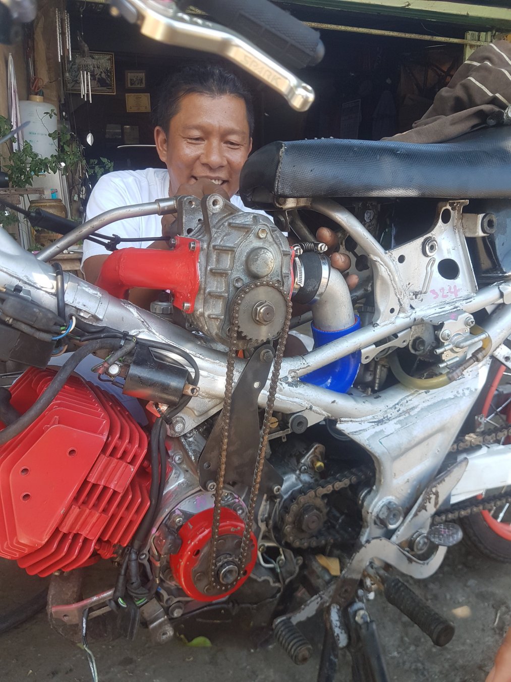 Thanks so much for the analysis, that's interesting. I will ask him how the low to mid range feels now. I was wondering on what basis he'd calculated the sprocket sizes and ratios - was wondering whether he was using math or guesswork, but my Thai is not so good. There's a lot of practical mechanical creativity here in Thailand but not so many people have the opportunity to access really good technical training to understand the principles behind it all, so you end up with a lot of trial and error. And some wild modifications! As you say, full marks for spunk. -