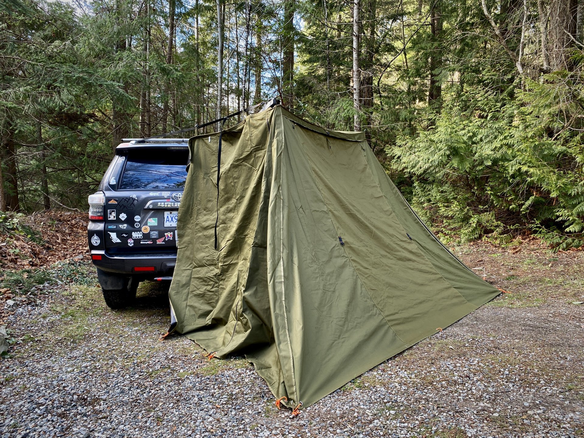The sun has been around this weekend so we took the opportunity to try out our new 23Zero Awning. We spoiled ourselves and got the add on walls. WOW!!! So nice, so much space.......LOVE IT!!!! . It will make for a nice set up if we decide to stay somewhere for a few days. This is not fully set up, didn't stake it in, but it just makes the 4Runner disappear......cool camouflage!