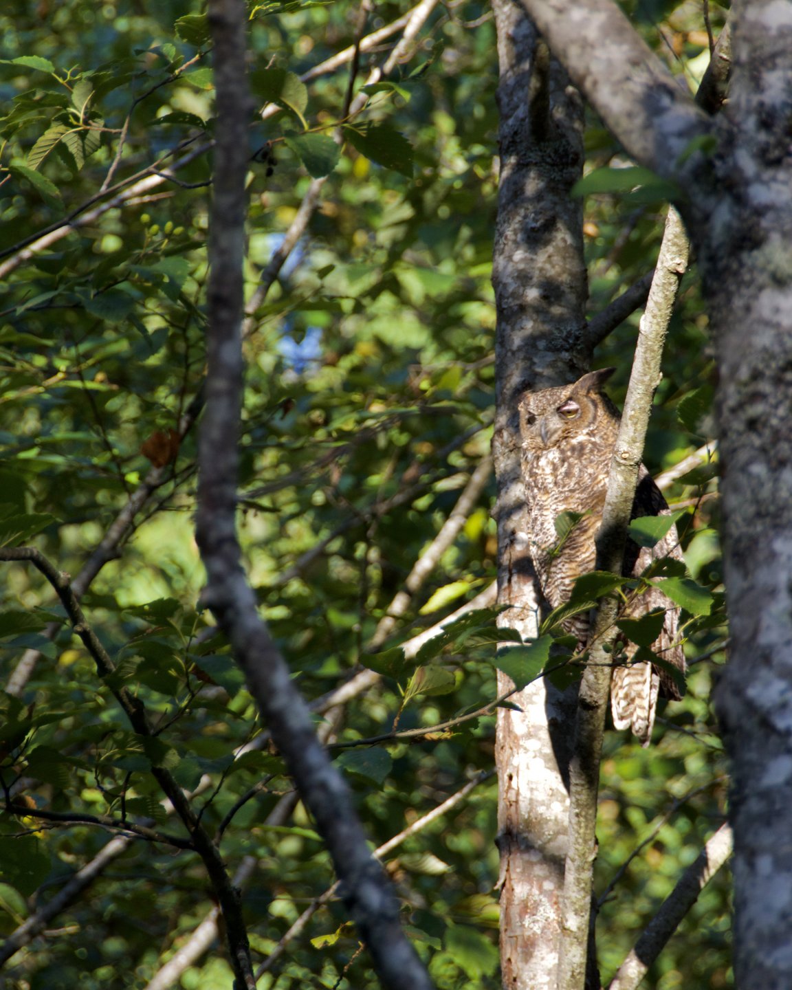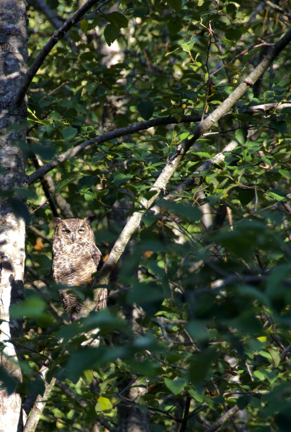 I have become lazy of late and have been leaving my DLSR (camera) at home and just taking my iPhone with me on hikes. Then this past year we have had a bunch of owls move into the hood. Great Horned Owls at that. I have tried to get a good shot with my phone, but it just isn't cutting it. The shots are blurry and just not what I was wanting. I needed to get the big camera out!!!!! But I also thought, a new lens has been in order, now might be the best time. So off I went on my Honda to seek out some fine Nikon glass! It was a cloudy day, so a bit cooler and with some lovely clouds over the water. I was in luck, the only local store that sells such things had just what I was looking for. Now to get out there and find my owl. I have become rather good at finding them in the forest, you have to be very quiet and know where to look, they like to sit in the middle branches and watch you walking by. I was very excited when I found one. They are getting comfortable with me so this one sat still nicely for my photo. I got a much better photo with my new lens, making for a very happy Grasshopper. It could be better, but the fun is in working on getting that perfect shot!