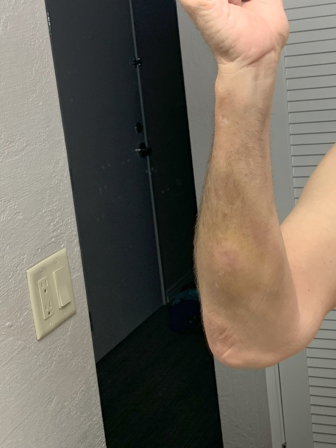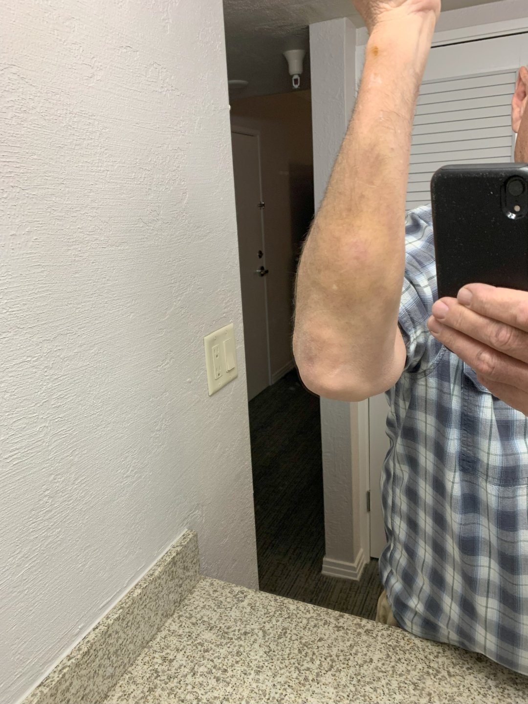 Had a bit of an injury on this trip. I'd like to say it was a result of staving off a tank slapper with my superior riding skills while doing 135 mph through a tight sweeper. But the truth is a bit more mundane - I slipped in the bath tub and biffed my arm on the way down. Fuckin' hurt!