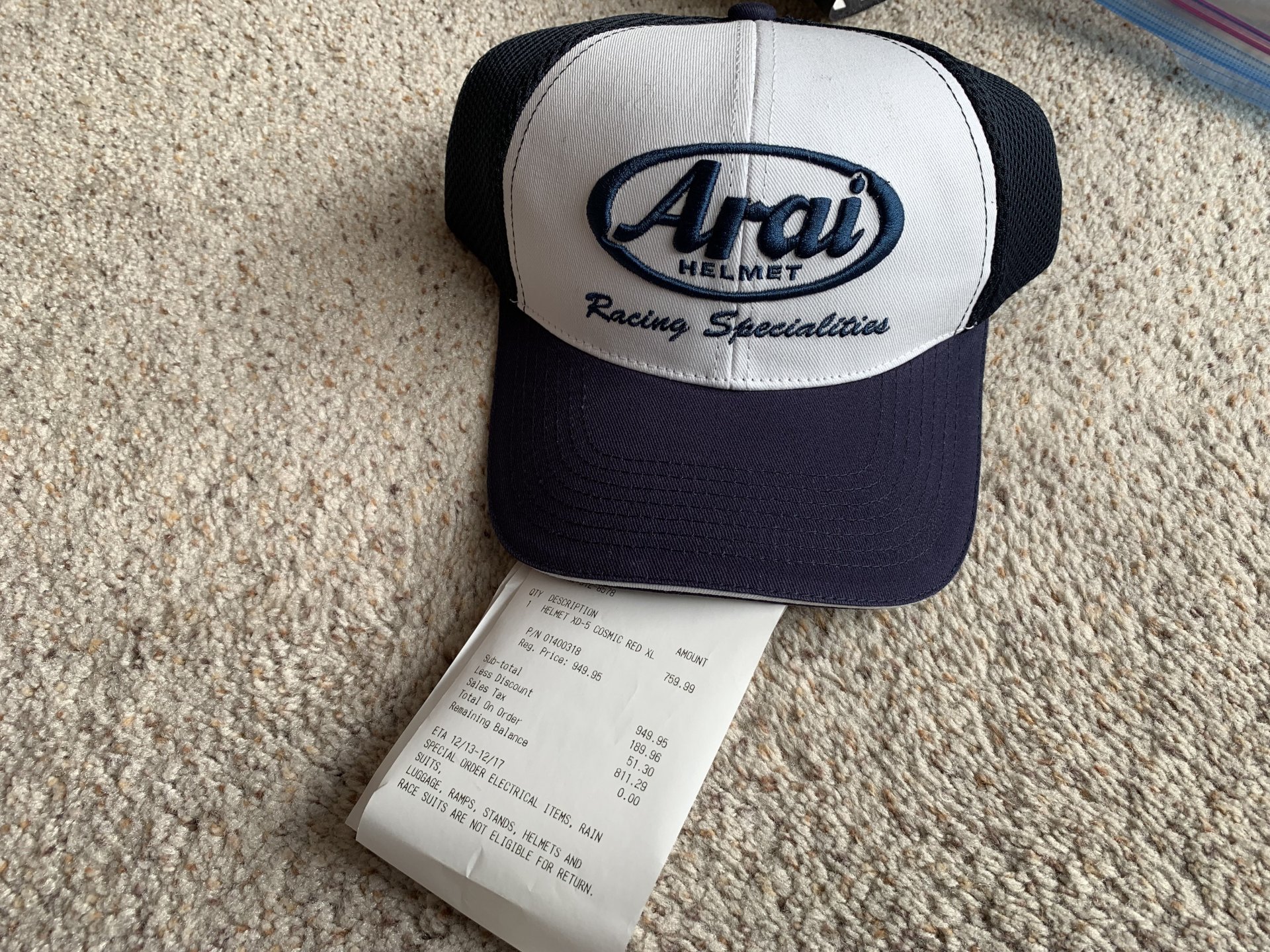Didn't have my helmet in my size - go figure. Had to order it with an expected arrival date of 2-3 weeks. So, for $811, I got to bring home this hat,,,,,