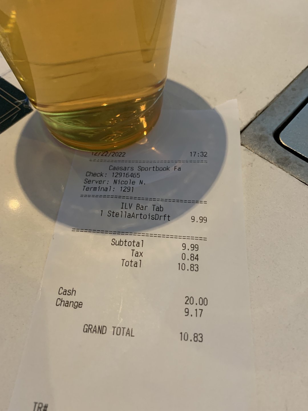 It's pretty much 1:1 right now - or close to it. Pints (and I'm talking US pints which are smaller in the first place) are running $7 each around here. $10 for a pint in Vegas was a new high for me. Add in the tip money and it's $12 a pint there. Back to the wife's hotel where it's free....