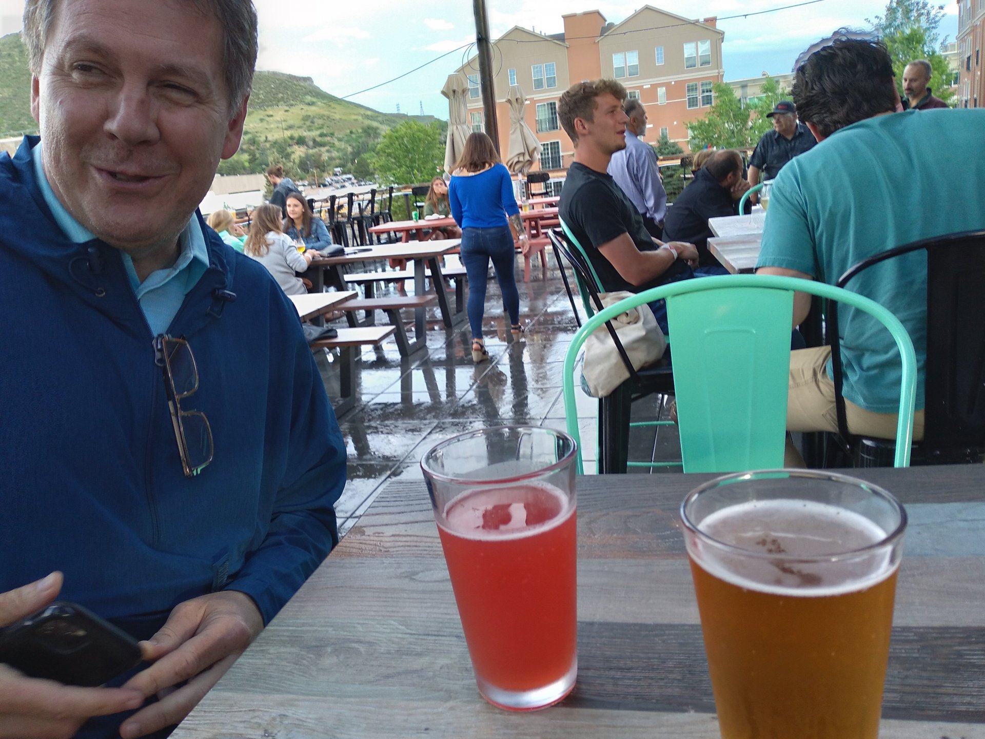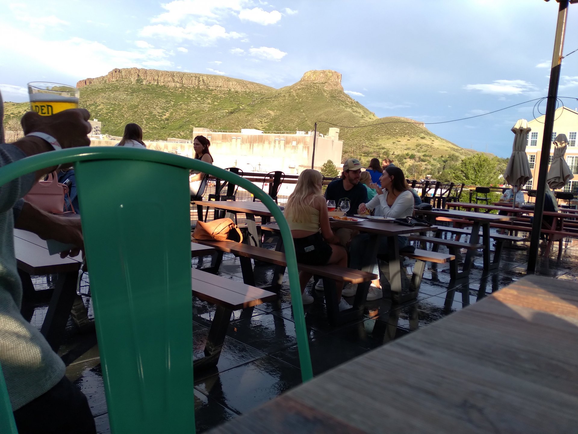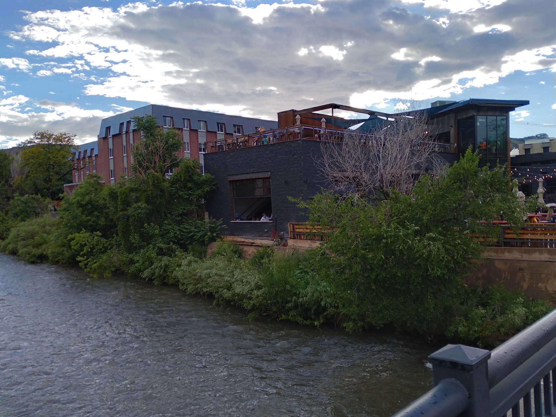 Wondered through downtown Golden and fell into the Golden Mill for dinner and beers. Weird place; you give them your credit card and then they give you a card that works in all of their card reader's. Then you walk up to one of the 30 taps in the place and pull your own beer. Most of the seating is outdoors on a large balcony above the river through town...