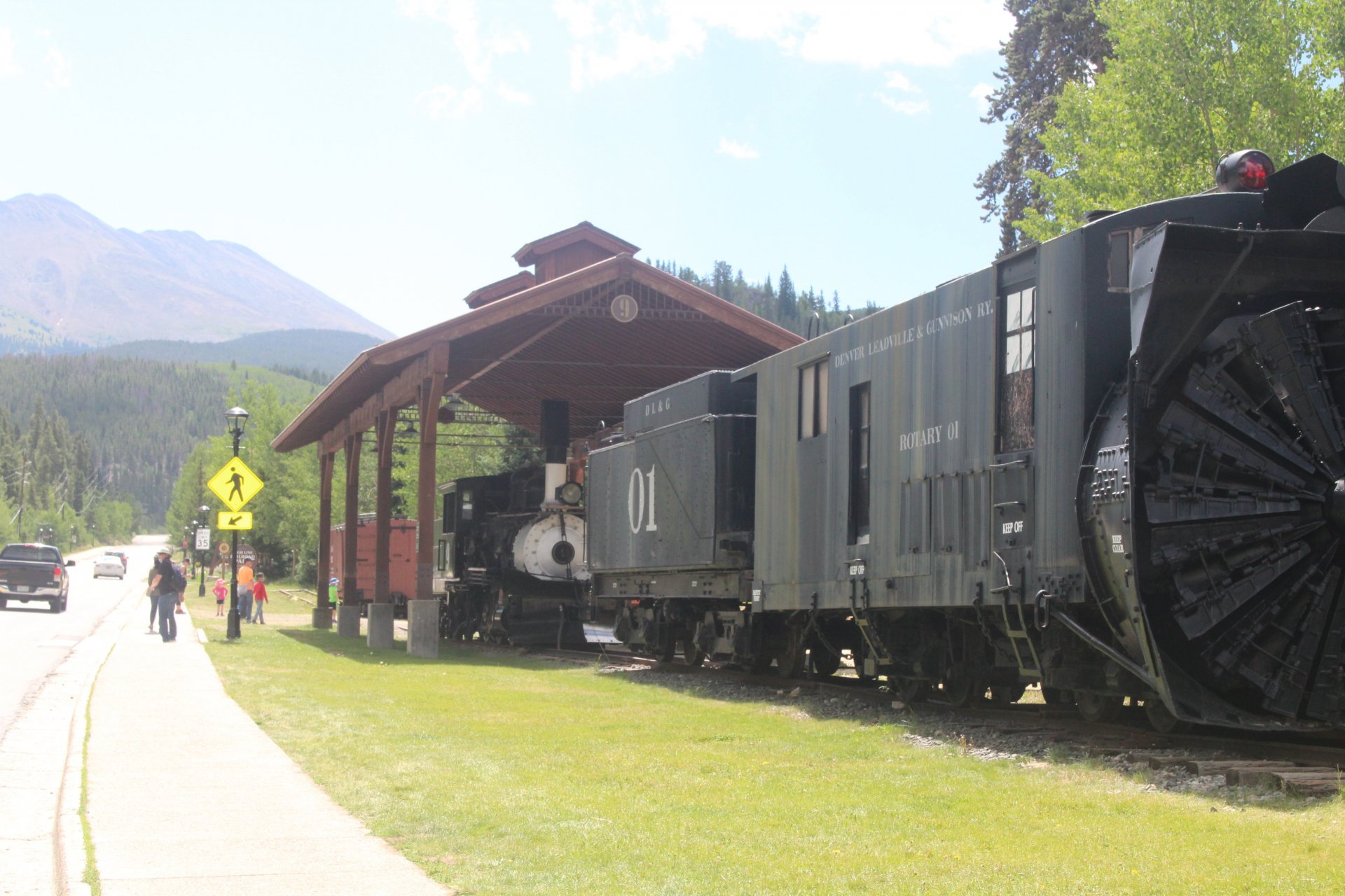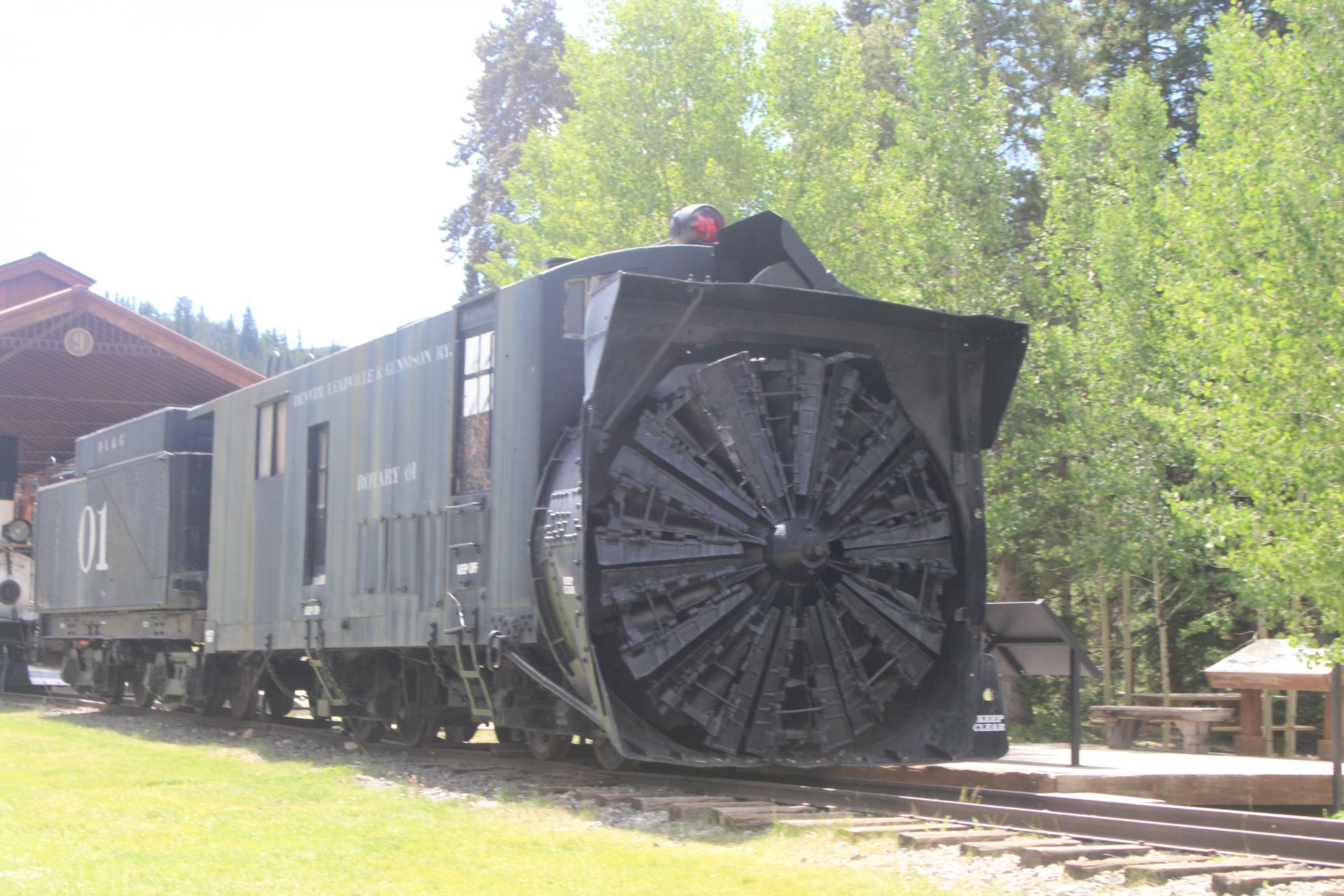 At the western bottom of the Pass are a steam engine and other cars used on Boreras. Quite the snow shovel on the first car...