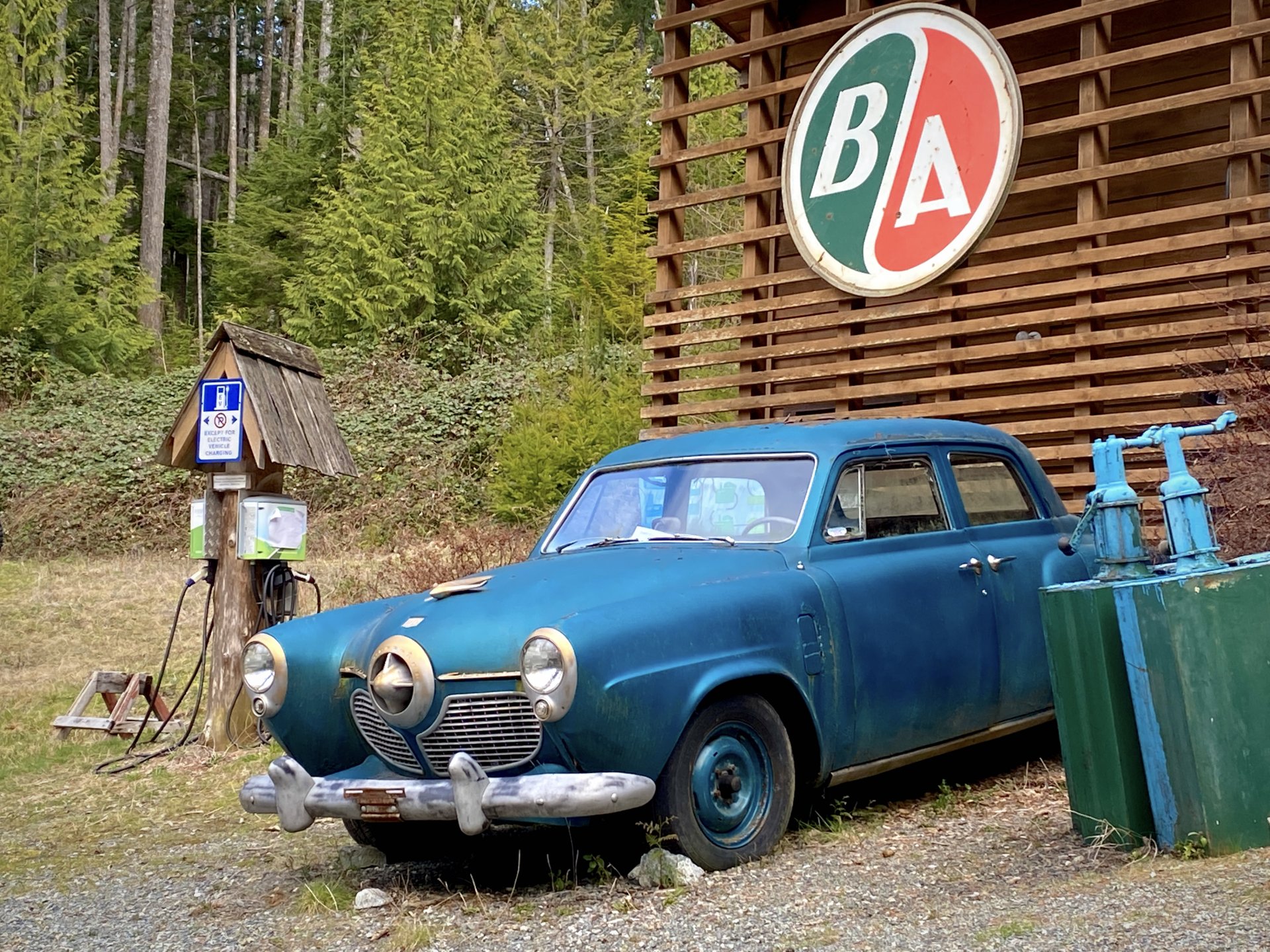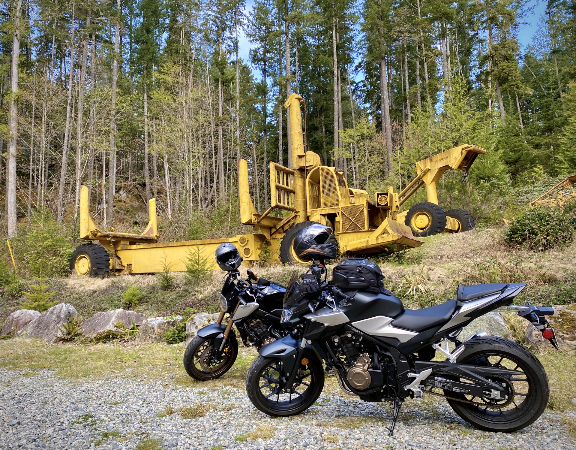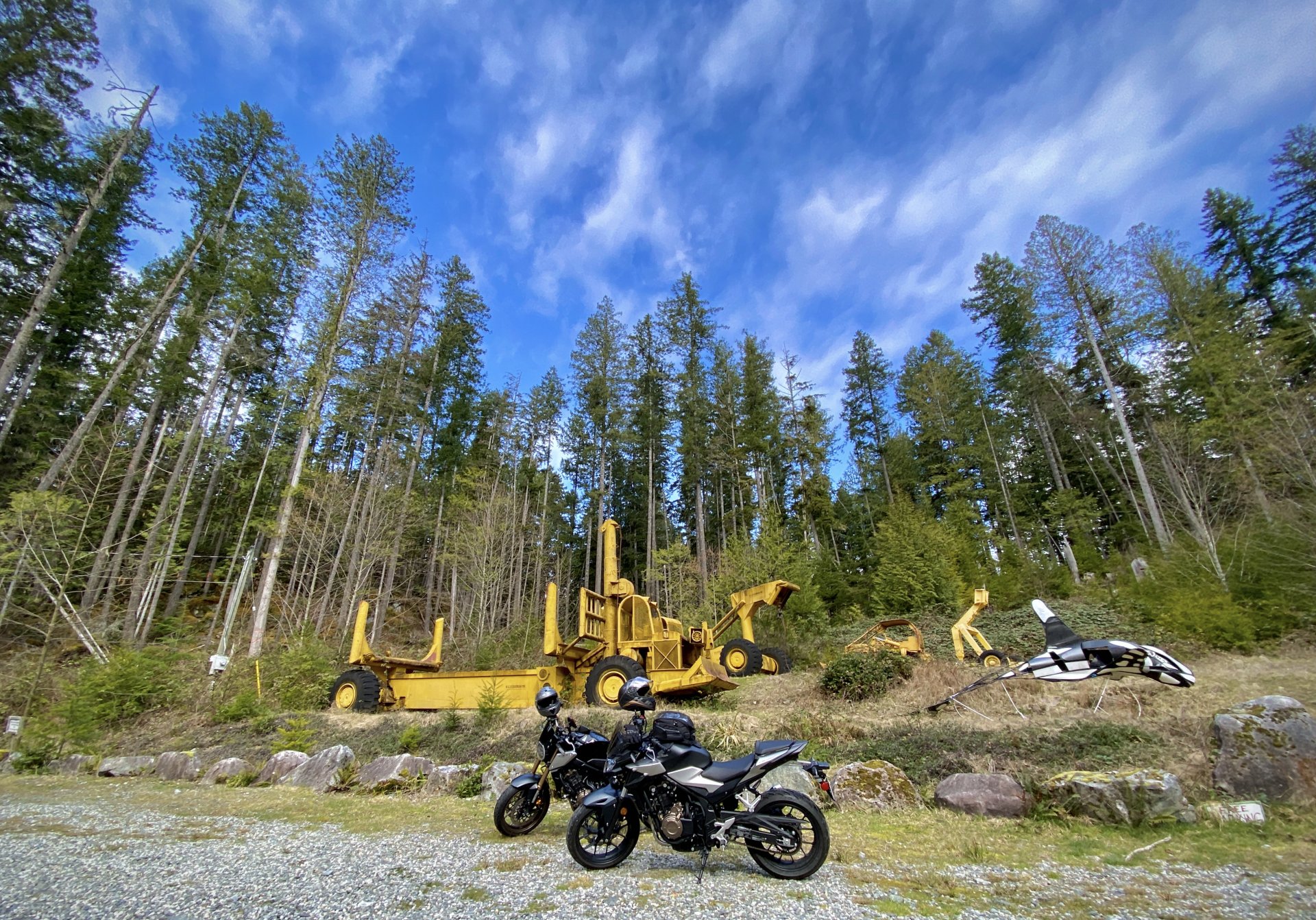After my excitement in the forest on Saturday, I almost forgot about my Friday. Having the two bikes is like having two different personalities. I'll just add them to my collection....? We went for a nice ride on the Hondas up the coastal highway to a Heritage Centre in Egmont, which is at one end of the coast. The centre was closed, but it was still a great place to stop and enjoy the odd items around the place. ? Like this cool old Studebaker! ? The heavy logging equipment was a nice backdrop for the bikes. There was the local fire truck and of course a native totem, as this is the traditional territory of the shÃshálh (Sechelt) Nation. ....and there was even a whale on wheels. It is a local symbol of the natives and most likely used in parades and such. It was a great ride and my fastest overall average speed on this stretch of road. It is all Charlotte's fault! I made up a short ride log video for your viewing enjoyment! ?