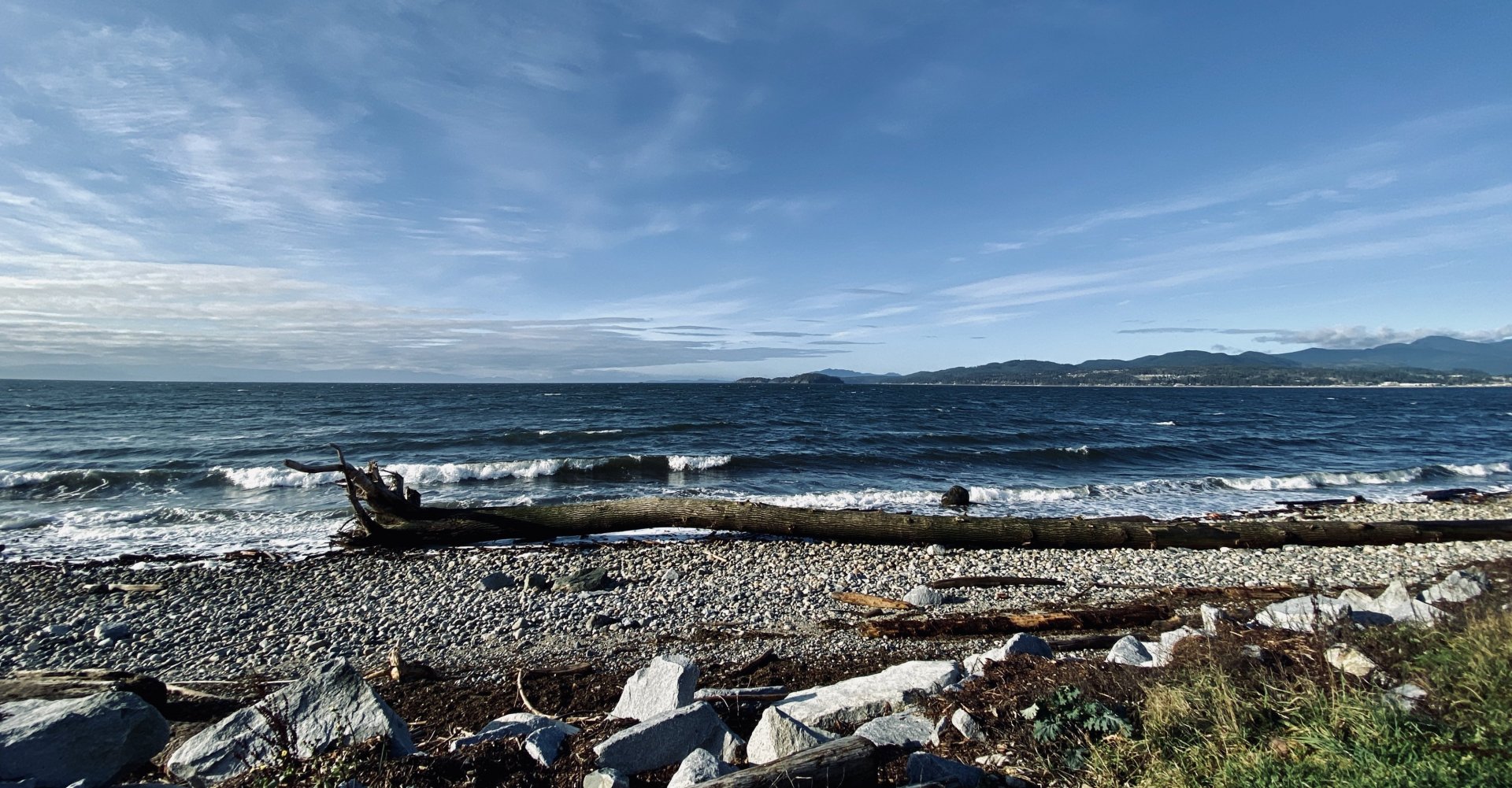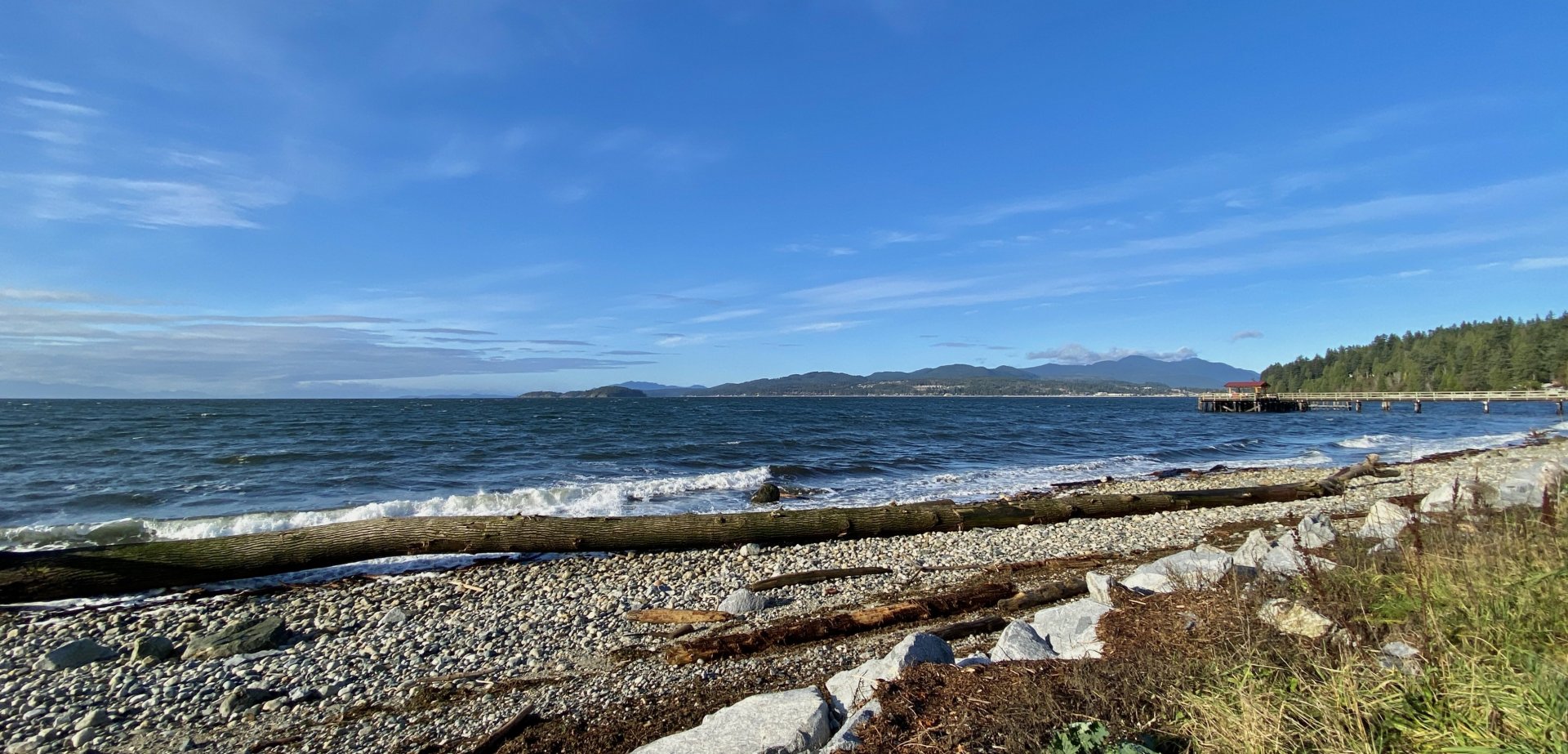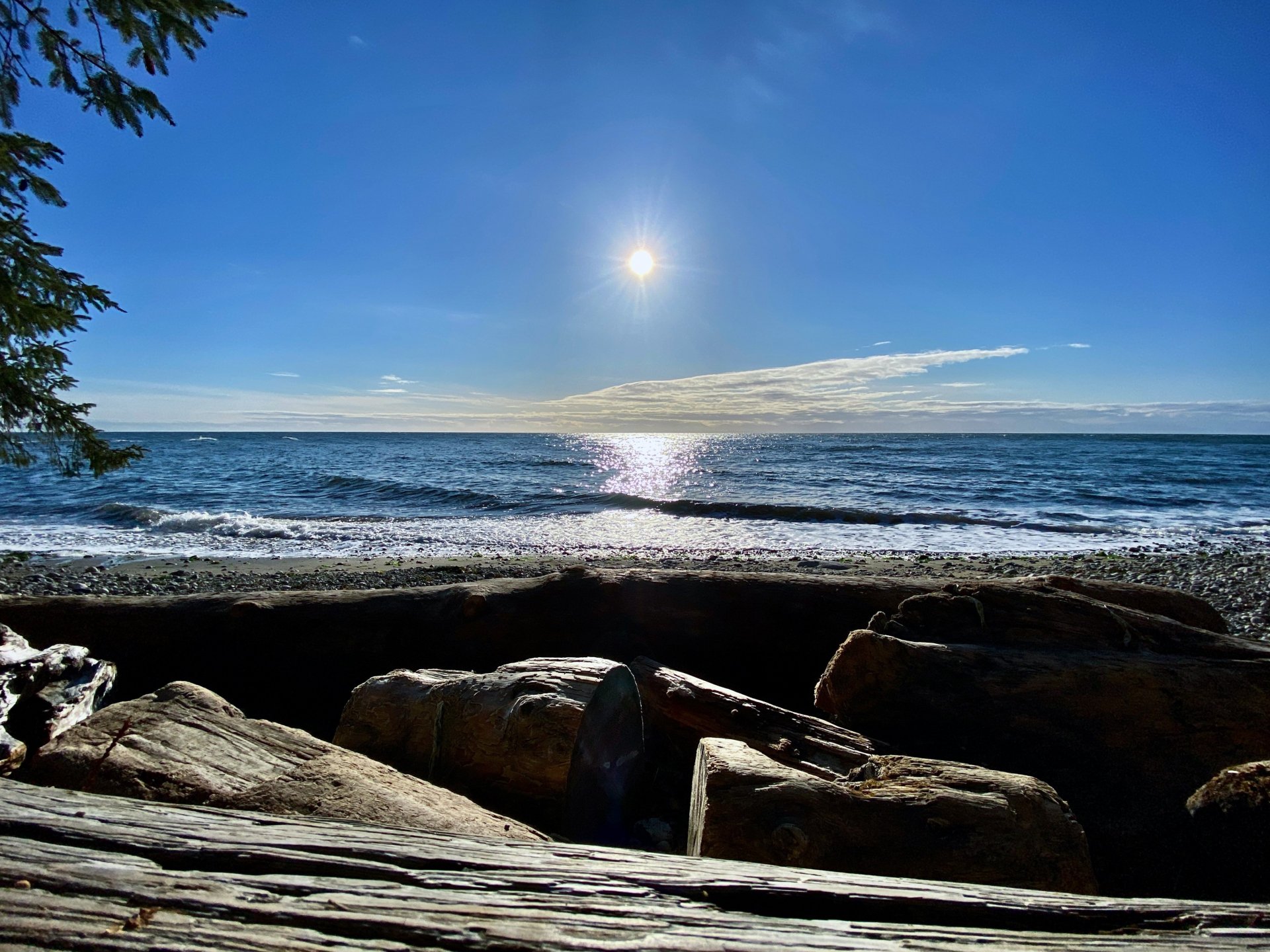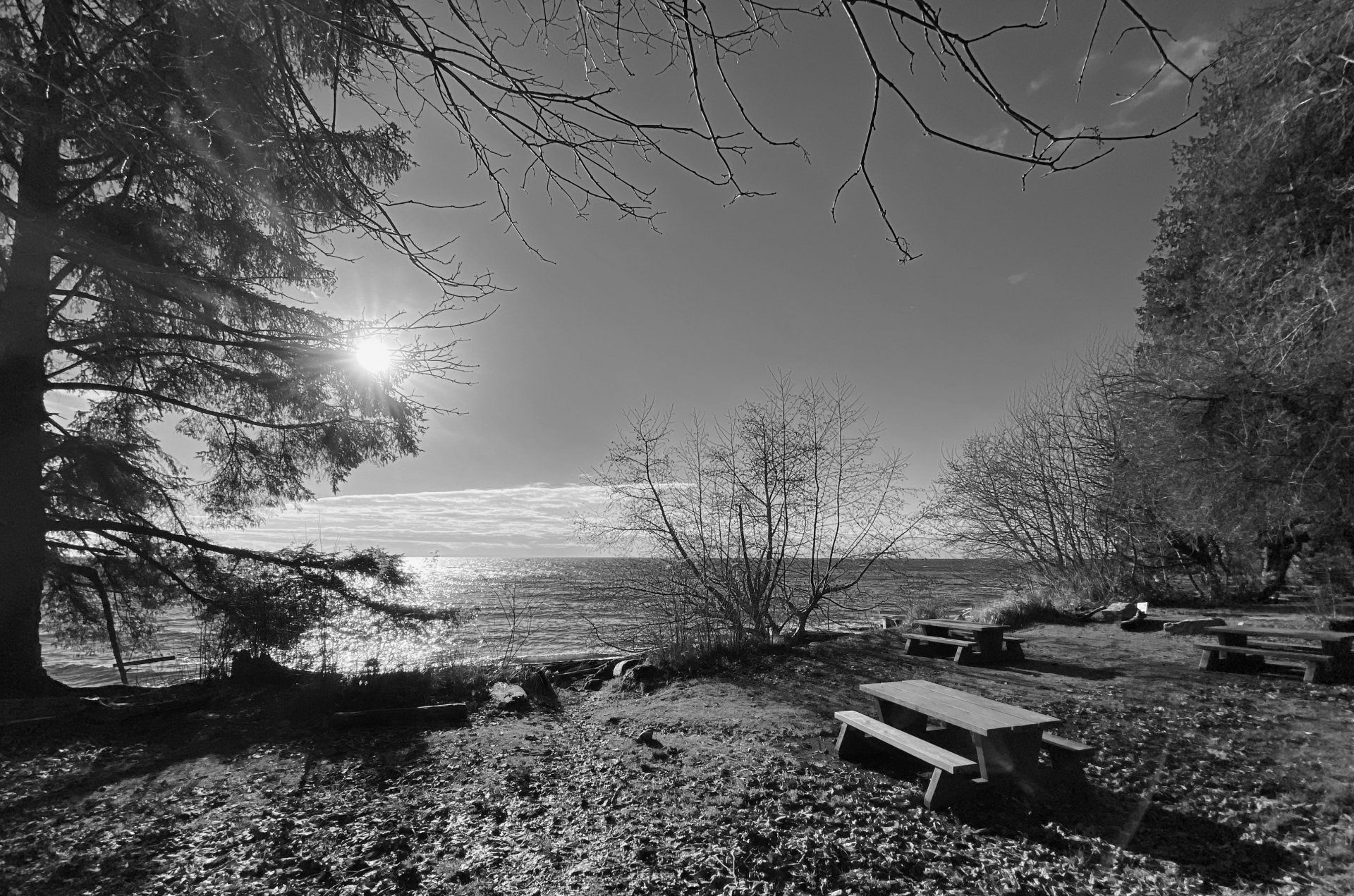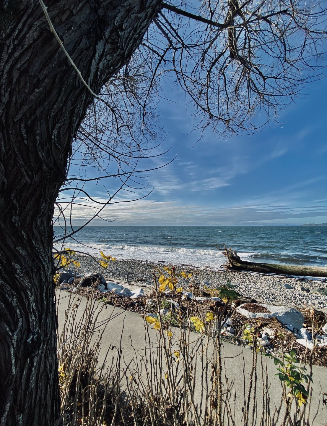 A Winter's Chill is in the Air Now that December is here, so is the chill in the air. While I was out and about the other day, I stopped by a local pier to enjoy the view and take in a bit of sun, as it can become rare to see this time of year. The moment I stepped out into the open I felt the crisp coastal air on my face and remembered, it certainly was December now. Along with the cool air there was a coolness to the colours around me. The water seems to take on a deep dark blue when it gets cold, making it look even deeper and colder. The sky matched the water with a certain cool blue you see only when it is cold. Even the old tree that had come ashore after a recent storm looked cool in the blue light. I managed to find some fall flowers that looked like they might be enjoying their last few days of sun. They were not the prettiest of flowers and most likely were looked over for the bigger picture scenery, but I certainly appreciated the small bits of yellow amongst the blue. Later on in the day, the sun drew me to the water again. There is something about how the sun dances across the water that can hold my attention like a cozy camp fire or rolling waves. The sun was low in the sky and warm on my face. A welcome dose of vitamin D for sure. The day was now getting on and I started back home to get warm by the fire. Before leaving I took a minute to sit at this local picnic spot and imagined all the energy that would fill this place on a warm summer day. But today, a cool day in early December, it was just me, a few quiet picnic tables and the sun, all watching the waves roll in.