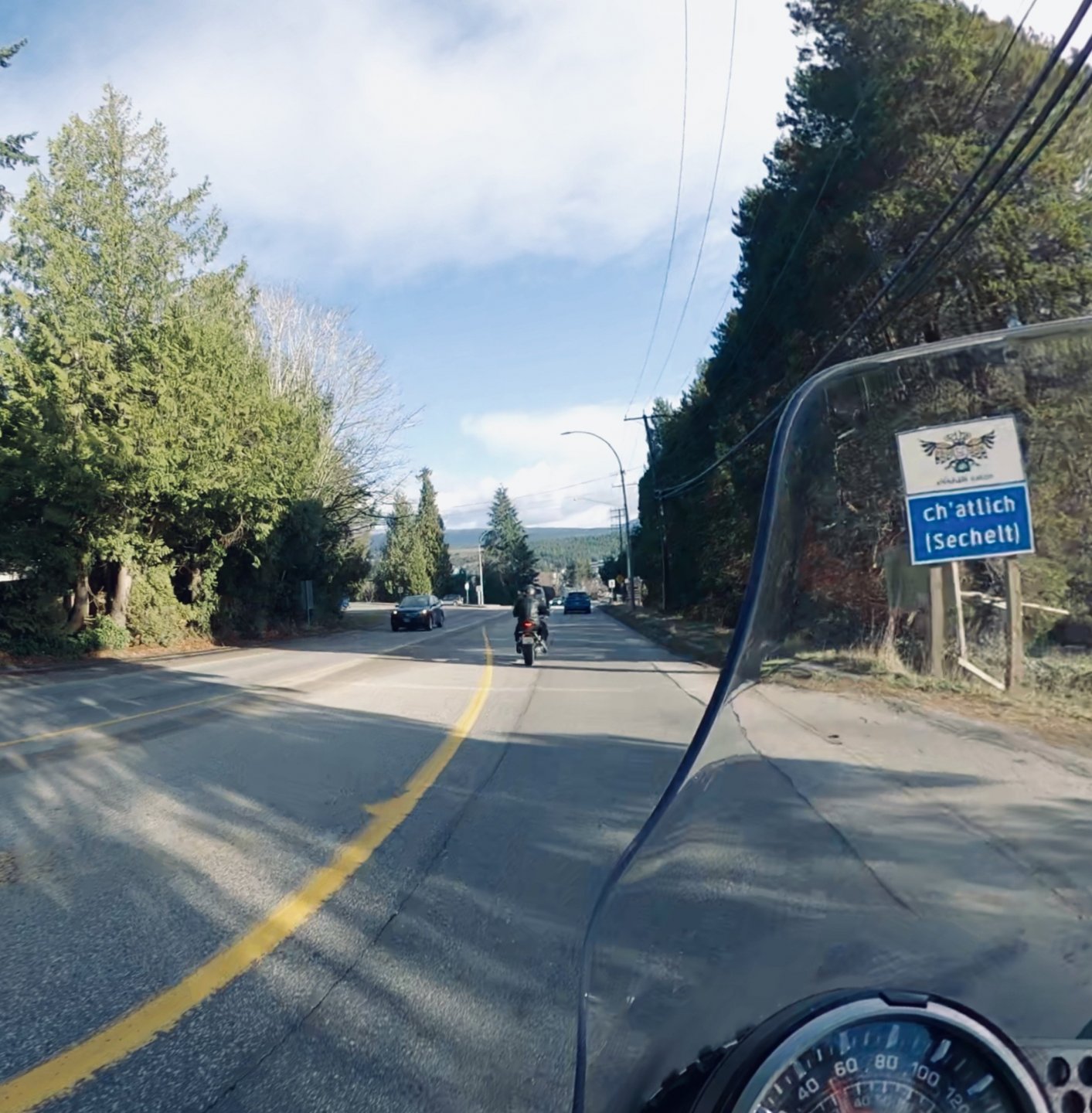 It sure was nice to get out for a ride today, had been over a week since I was out last. Unfortunately, it was a working day, so it was only a short ride into town for some required evening beverages! It was sunny, but a bit chilly, just about 5 degrees I believe. There was still snow around from earlier in the week, but the roads were clear. Headed into the big town of Sechelt, or also known as ch'atlich in the local native language. We recently had all our road signs changed to show both languages, kind of cool! The big trucks don't normally turn here, so I was just keeping an eye on the big guy! The ride home was really nice, the roads were empty and the lake was looking marvellous! A short, but a very much needed ride in the sun for the Grasshopper!